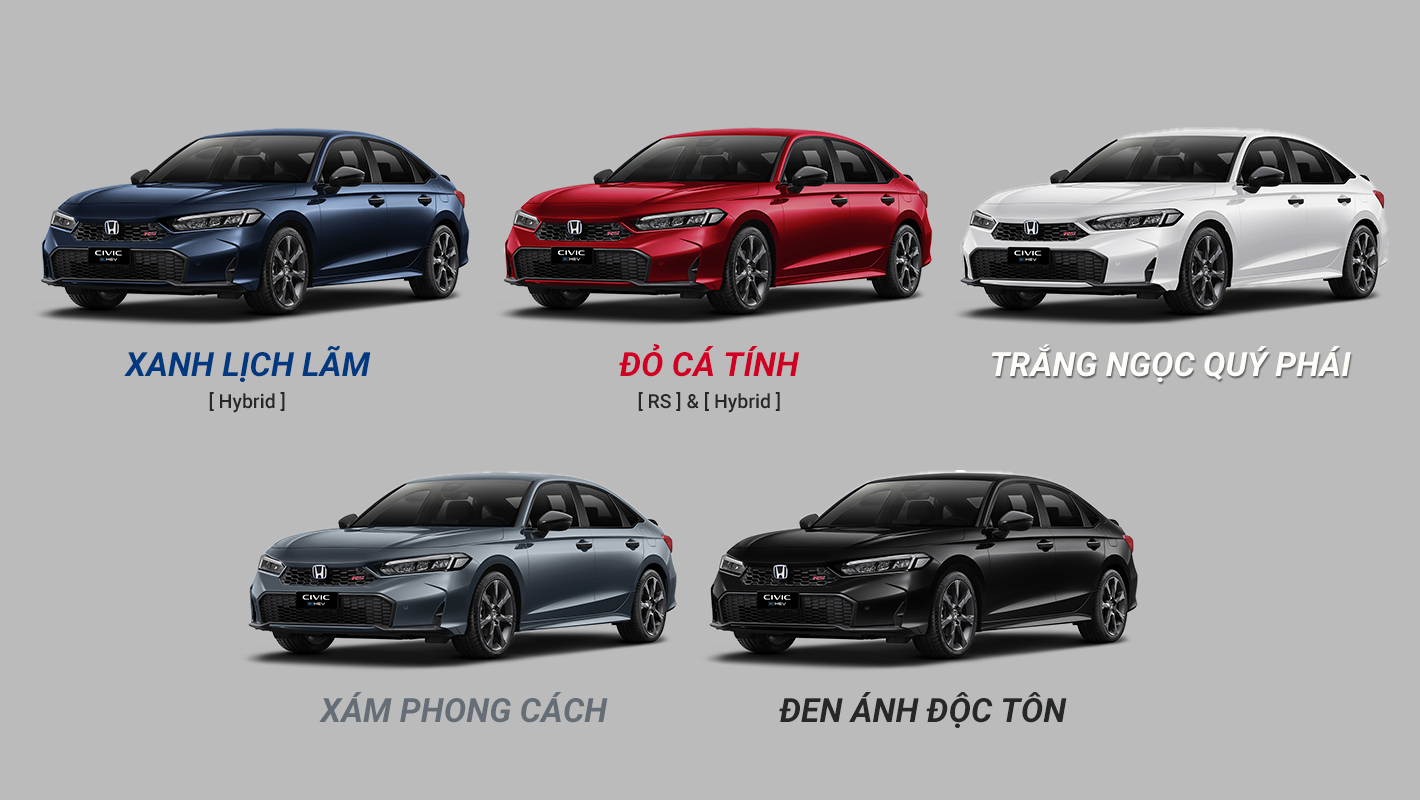 - Honda Civic e:HEV RS: Trắng ngọc trai, Đen, Đỏ, Xám, Xanh